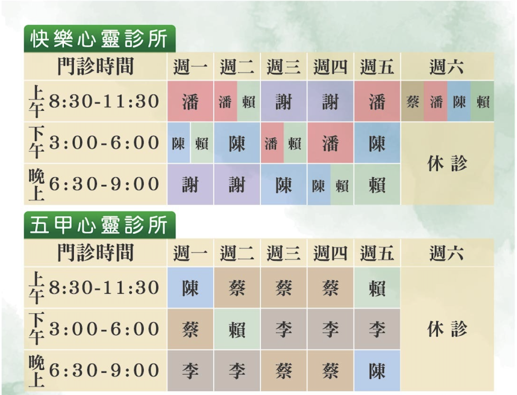 「快樂心靈診所」的病人數較多,相對醫師能給一位病人的時間是有限的。「五甲心靈診所」的醫師可以跟病人談的時間較多,不過受限於健保體制,我們也不能讓外面的病人等太久,還請大家體諒。
